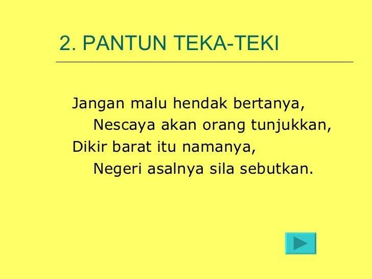 Pantun teka teki lawak 2 kerat. Pantun dalam bentuk pantun 2 kerat 4 kerat 6 ataupun 10 kerat adalah sebahagian daripada kesenian bahasa dalam budaya masyarakat Nusantara samada untuk adat istiadat nasihat pendidikan gurauan hiburan majlis keramaian dan juga dalam perbualan harian. Terima Kasih kerana menyokong Channel ini. Home Pantun lawak 2 kerat Baik pantun jenaka pantun nasehat pantun cinta pantun lucu pantun agama atau pantun teka-teki semuanya disukai oleh orang.